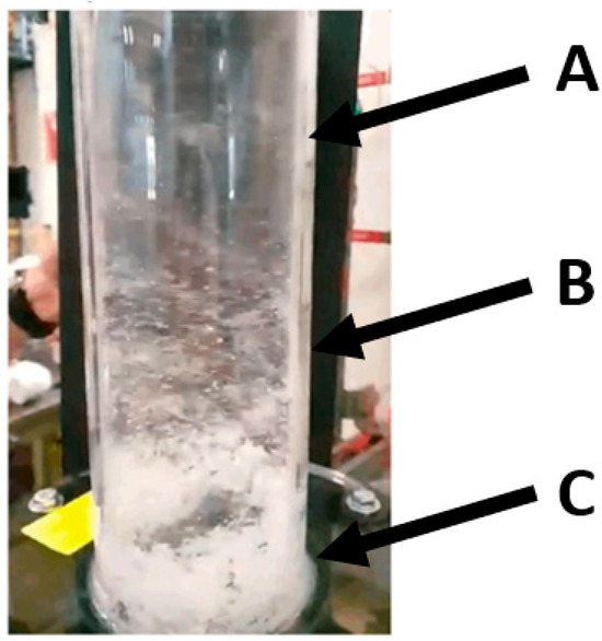 During the operation of the cyclone extractor, depicted in Figure 16, several observations were made. The degree of particle entrainment varies as the vertical height of the column is increased. Furthest from the fluid particle interface, at A, there is less particles than lower down at B and C. This is likely due to two factors: The first is the disbursement of the pneumatic airstream. The nozzles are located at C, which results in a high-speed, strongly swirling flow that separates as it moves vertically up the column. This separation then results in a vertical and swirl speed decrease as it transitions from C to B and then from B to A. The second factor is the entrainment of the particles. Some particles do not remain sufficiently entrained in the flow. This causes them to separate and fall back down to the particle interface. This was seen to occur at B and C, where the flow is chaotic and turbulent. This phenomenon indicates that scaling the separation technology to industrial scale—by increasing the extractor height—may result in a greater degree of difficulty entraining these particles in the flow, decreasing separation efficiency. However, it was noted that as the particle–fluid level increased, as more particulate entered the test reactor, the separation between the nozzles and interface reduced. This reduction corresponded to a greater degree of particles becoming entrained in the airstream.