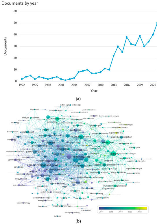 There are a large number of research papers dedicated to polygeneration systems. The Scopus database (November 2023) was used to identify these publications and cluster the keywords. Such an approach can help readers obtain an overview of the already-published results and highlight the directions for research. Thousands of publications were identified using the keyword “polygeneration”; later, they were filtered using the field of research “energy” with attention to “carbon dioxide” (as emissions and as the working fluid). Only publications in English were considered. Finally, a list of around 500 research publications was generated. The dynamics of the publications are shown in Figure 1a. Only papers published during the last 10 years were further used to cluster the keywords (Figure 1b).