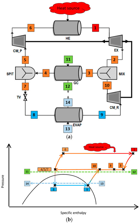 A gas cooler (GC), a mixer (MIX), and a splitter (SPLIT) link these sub-cycles. Carbon dioxide is the working fluid for the entire system. The heat capacity is generated within the gas cooler. The system can generate net power as the difference between the power from EX and the power required by both compressors (CM–P and CM–R).