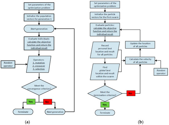 Implementation of optimization algorithms: (a) differential evolution-DE; (b) particle swarm optimization–PSO.