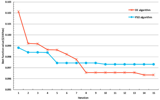 For example, the best values of decision variables obtained from both optimization algorithms for Casecold are shown in Figure 5. The PSO algorithm already had a better starting position in the first iteration and continued to lower the objective function until the fifth iteration. A local minimum was identified within the sixth to ninth iterations, which had further minor corrections until the tenth iteration. No better value is obtained after the 10th iteration. Another dynamic is observed for the application of the DE algorithm. Significant progress was achieved in the second iteration; a local minimum was identified within the eighth to eighth iterations, with minor corrections within the fourteenth to fifteenth iterations.
