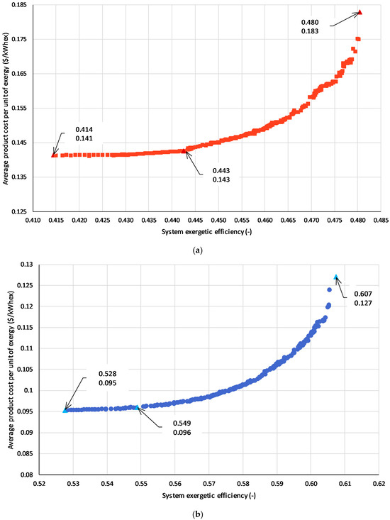The Pareto frontiers for the polygeneration system: (a) Casehot,; (b) Casecold.