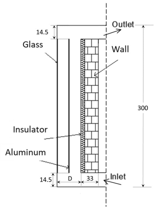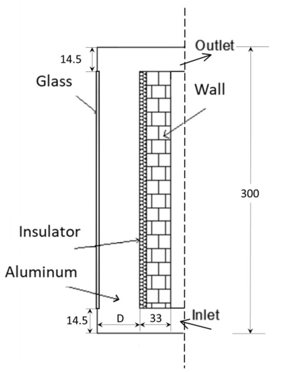 The TM wall consists of glass, a cavity, and a massive wall. In the modified BC system, a 2 mm thick blackened aluminum sheet is inserted in the center of the layer to increase the absorption of solar radiation. The massive wall (2.71 m high and 0.33 m thick) presents an 8 cm thick layer of insulation on its south side facing the cavity. The inlet and outlet vents are 14.5 cm wide. The following interlayer thicknesses were chosen as the model’s variable parameter: 10, 12, 16, 20, 22.5, 25, 30, 40, and 50 cm. The results of these structures were compared with those obtained with the traditional TM wall with the same dimensions.