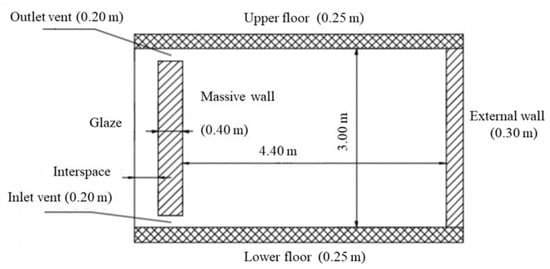 Also, in transient conditions, 2D simulations of a modified BC system and a traditional TM wall were carried out. In this case, the entire environment to heat was considered, i.e., a room that was 4.4 m long and 3 m high. The thicknesses of the floor and ceiling were 0.25 m, the north wall was 0.3 m thick, and the massive wall was 0.4 m thick and 2.6 m high. Among all the thicknesses simulated in the steady-state conditions, only three were applied in the transient state: 0.1, 0.2, and 0.5 m. In fact, the steady-state simulations already demonstrated that the thickness of the cavity did not significantly influence the computed quantities of interest (i.e., temperature). The width of the air inlet and outlet vents was 0.2 m, and the thickness of the aluminum absorbing sheet was 2 mm. Figure 3 and Figure 4 show the TM and BC structures, respectively.