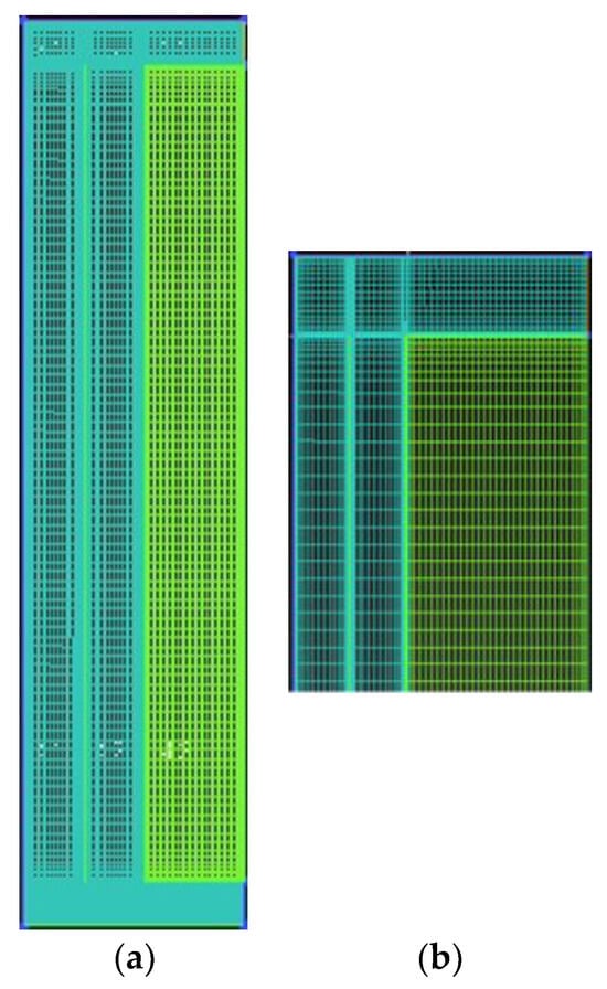 Details of the mesh of the modified BC structure simulated in steady-state conditions: (a) entire wall structure; (b) sample of a corner.