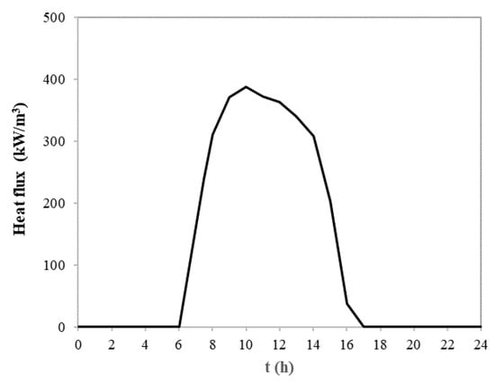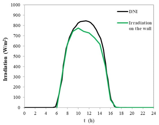 The solar radiation intensity was obtained from the direct normal irradiation values in the city of Rome. To calculate the effective irradiation on the glass surface, the direct radiation was multiplied by the cosine of the solar height, as supplied by the website www.sunearthtools.com. Figure 7 shows the direct solar intensity and the effective irradiation during the simulated hours, while Figure 8 shows the heat flux generated per unit volume in 24 h for the BC wall. The heat flux reported in Figure 8 was assumed to be the same for all the simulated five days (120 h).