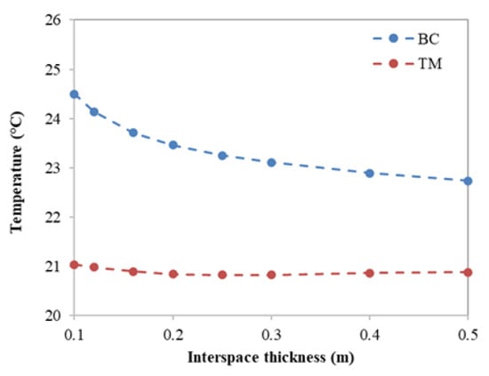 Figure 15 shows how the same temperature changed with three different interspace thicknesses (10, 20, and 50 cm). It is evident that the thickness of the cavity did not produce significant changes both in the phase and intensity of the temperature response in the modified BC system and TM system. The minimum high-temperature peak (25.02 °C) happened in the first day for the 10 cm thick interspace, and the maximum (26.09 °C) occurred in the fifth day for the 50 cm thick interspace. That is, a 500% increase in the thickness produced only a 4% increase in the maximum temperature.