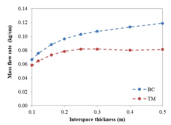 Exit mass flow rate as a function of the thickness in modified BC and TM walls.