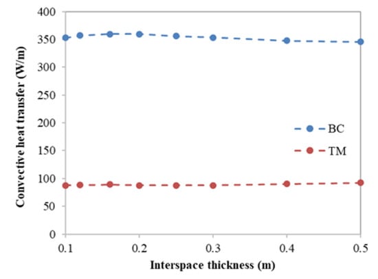 Figure 11 shows that the convection heat transfer was practically independent of the thickness of the cavity in both systems. This was due to the temperature increase observed when the thickness of the cavity decreased. This was compensated by a decrease in the flow rate, which consequently produced an almost constant convective heat flow. It is evident that the average convection heat transfer of the BC system (Figure 11) was four times that of the TM system, which was because of the BC insulated wall. Thus, the whole thermal power received by the sun was transmitted by free convection in the BC system. On the contrary, in the TM system, the thermal power was transmitted by convection in the cavity and by conduction within the massive wall.