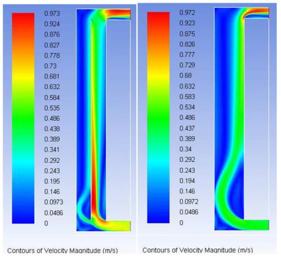 Velocity field of modified BC wall (left) and TM wall (right) for interspace of 0.40 m.