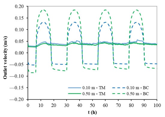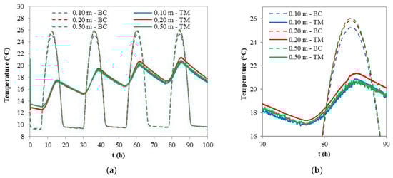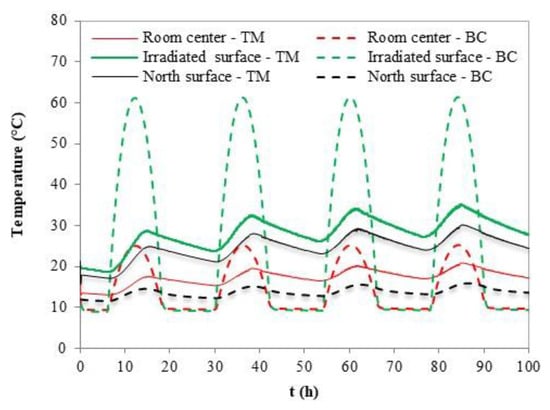 The dynamic response of the BC system was much shorter than the TM one, as evidenced by the results shown in Figure 14. In fact, the BC system already overcame the transient state within the first 24 h, while the TM system presented a continuous temperature increase even throughout the five days. These results agree with those reported in case 1 of [].