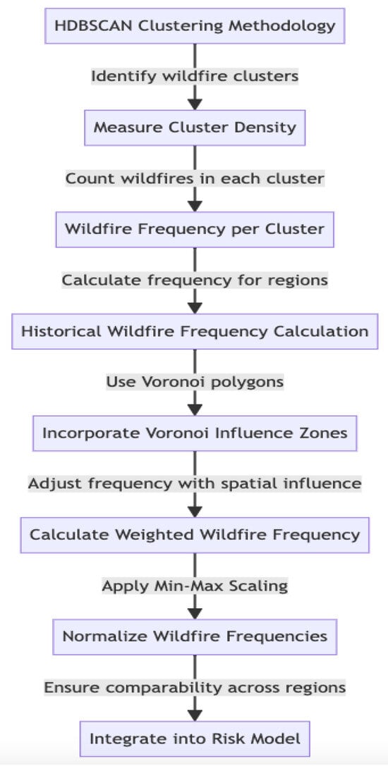 Using the HDBSCAN clustering methodology, clusters of historical wildfires are identified across regions. Each cluster’s density provides an immediate measure of wildfire frequency for that specific region. Let us denote the number of wildfires in a given cluster as .