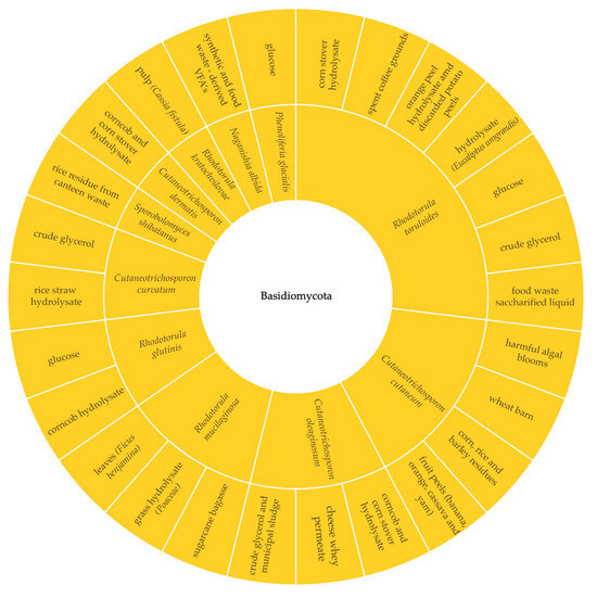 Currently, various yeast species have been used for lipid production as a basis for biodiesel generation. These species are classified within the Phyla Ascomycota and Basi-diomycota of the Fungi Kingdom [10,36]. As shown in Figure 1 and Figure 2, the most widely used yeasts from the Ascomycota Phylum include Yarrowia lipolytica, Lipomyces starkeyi, Saccharomyces pastorianus, Candida tropicalis, and Metschnikowia pulcherrima. From the Basidiomycota Phylum, species such as Cutaneotrichosporon sp., Rhodotorula sp., Naganishia albida, Phenoliferia glacialis, and Sporobolomyces shibatanus [15,18,19,21,24,26,27,32,35,37,38,39,40,41,42,43,44,45,46,47,48,49,50,51,52,53,54,55,56,57,58,59,60,61,62,63,64,65,66,67,68,69,70].