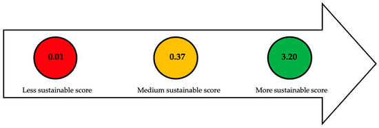 Figure 4 displays the ordinal classification of the carbon source mentioned in this section. The numbers within each of the traffic light circles correspond to the highest global sustainable score (green), the average global sustainable score (yellow), and finally, the lowest global sustainable score (red).