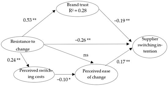 Our additional interest was the indirect effect(s) on SI through certain variables. Further analysis shows the existence of an indirect effect of resistance to change on perceived ease of change through perceived switching costs (two-tailed p values = 0.05), perceived switching costs on switching intention through perceived ease of change (two-tailed p values = 0.05), and resistance to change on switching intention through brand trust (two-tailed p values = 0.002). A detailed list of standardized effects (direct, indirect, and total effects) is presented in Table 4.
