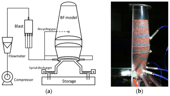 The experimental model of a commercial blast furnace used in this paper was scaled down by 1/15, as shown in Figure 1. Figure 1a shows the schematic of the cold experimental BF model. The experimental system consisted of an oil-free silent air compressor, a flow-regulating valve, a pressure-regulating valve, an oil–water separator, a glass rotameter, a blast furnace half furnace model, a motor, and a spiral discharge device. During the experiment, particles were added to the model from the upper part of the model, and the model was discharged in the raceway. The discharge speed was controlled by the spiral discharge device to simulate the disappearance of particles. A blast was provided by the air compressor, and the air entered the model through the flow-regulating valve, the pressure-regulating valve, the oil–water separator, the glass rotameter and the tuyere to simulate the updraft in the actual blast furnace. The BF model maintained good sealing properties with the interface of the tuyere, spiral discharge device and recovery bin, which ensured the accuracy of the results. As the OBF was designed with recycled gas in the body, the recycled gas design is shown in Figure 1b. The parameters of the experimental model are shown in Table 1.