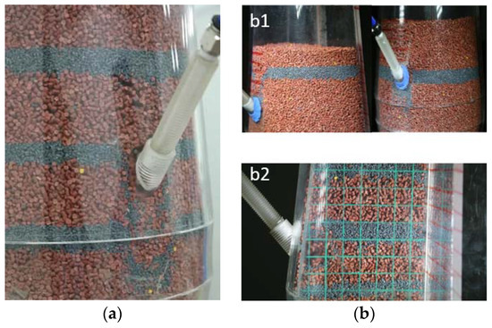 Therefore, in the subsequent experiments, the lower tuyere and upper recycled gas were not utilized as essential conditions for the experiment. From the experimental results of a double blast, the overall movement of the burden exhibited plug flow, with a convergence phenomenon occurring in the lower region. Comparing these results with Figure 2, there is minimal disparity between them. The solid–solid flow is primarily characterized by piston flow, and the impact of blast conditions on the general trend of downward solid flow movement is limited; however, recycled gas near the upper tuyere has a greater influence. In order to elucidate more clearly how recycled gas affects particles’ descending motion, an experiment involving recycled gas within a single furnace body was conducted. The blast flow rate of recycled gas (with only one tuyere) was set at 7.5 m3/h, while maintaining a discharge flow rate controlled at 0.24 kg/min. The gas flow rate was tripled during this experiment. The observed effect from outside is depicted in Figure 3a, where it becomes evident that recycled gas has a noticeable impact on the exterior surroundings of the model tuyere; specifically, it causes a V-shaped deformation in the burden layer near the tuyere opening and confusion when tracer particles reach higher levels close to this area. By means of the cutting method, the solid flow by recycled gas was obtained, as shown in Figure 3(b2), and except for a slight effect near the walls, the recycled gas has little significant effect on the internal burden.