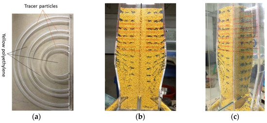 The experimental particles used in this paper were cylindrical polyethylene particles. Two kinds of experimental particles were used—dark red polyethylene particles and yellow polyethylene particles. The particles of the two different colors had exactly the same properties. The granulometry of the particles was 4 mm (diameter). The diameter of the particles in actual blast furnaces is roughly 5 mm~80 mm, and so the particle diameter ranged from 2 mm to 35 mm. The diameter of the polyethylene particles selected in the experiment was 3~5 mm, meeting the requirements. The packing angle of polyethylene particles of this shape is 40°. The accumulation angle of the actual coke is generally between 35° and 45°, so the choice of cylindrical polyethylene particles is more suitable. Among them, in order to distinguish between the two experiments, different color particles were used—dark red particles for the recycled gas experiment and yellow particles the raceway experiment. In order to characterize the burden layer, it was necessary to add tracer particles at regular intervals to characterize the traces lines and timelines. The tracer particles in the experiment were black polyethylene particles with a diameter of 2.5 mm, and other parameters were consistent with those of the dark red particles and yellow particles.