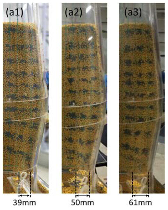 Traces of solid flow under different raceway conditions—3 raceway depths: (a1) φ = 39 mm; (a2) φ = 50 mm; (a3) φ = 61 mm.