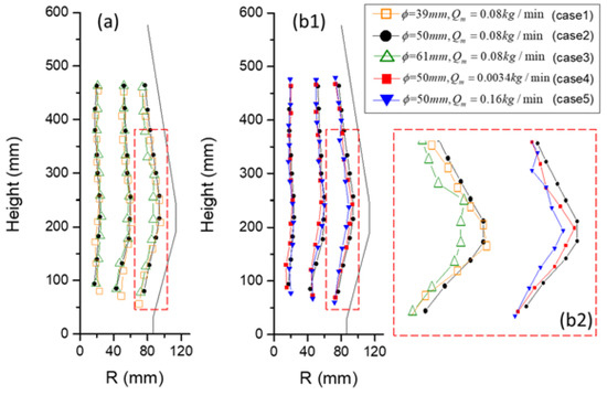 A summary of the three trace lines under different raceway sizes is presented in Figure 6a. In the case of an oxygen blast furnace, the raceway is theoretically small, and the trace of the outer solid flow is observed to be relatively close to the furnace wall. On the other hand, the inner solid flow near the BF center follows a nearly straight trajectory. Figure 6(b1) illustrates the summary of three trace lines under different particle discharge rates. Comparing these results with those obtained for raceway sizes, as shown in Figure 6(b2), it can be observed that there is no significant variation in the trace lines for case 4 and case 5. This suggests that while raceway sizes are indeed a major factor influencing the burden’s descent movement, their correlation with discharge rate is low. When an OBF operates under full or high oxygen enrichment instead of under traditional blast conditions, there is a substantial reduction in kinetic energy from blast gas injection. Therefore, it becomes crucial to control the appropriate operational conditions for producing an optimal size of raceway when operating an oxygen blast furnace.