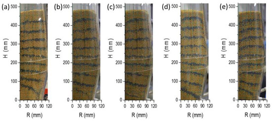 Figure 2 shows a burden structure with upper and lower blast conditions. There is no significant difference in the particle descending motion between the lower blast and the non-blast conditions compared with [21]. The comparison of the two results is shown in Figure 2a,d. Under the standard working conditions, the blast flow rate is 2 m3/h in every tuyere. Oxygen blast furnaces need to be preheated by feeding recycled gas into the upper burden layer of the furnace because of its cooling and heating [25]. In order to study the influence of recycled gas, according to the previous calculation, the blast flow rate of recycled gas (with only one air outlet) needs to be calculated. The other parameters and the experimental process are unchanged. The timeline distribution is shown in Figure 2a. Comparing the timeline distribution of the two graphs, it is found that the overall speed of the burden layer’s descent increases without a blast, but the descent law is basically the same. It can be concluded that the change in the lower tuyere blast has little effect on the burden’s descent behavior.