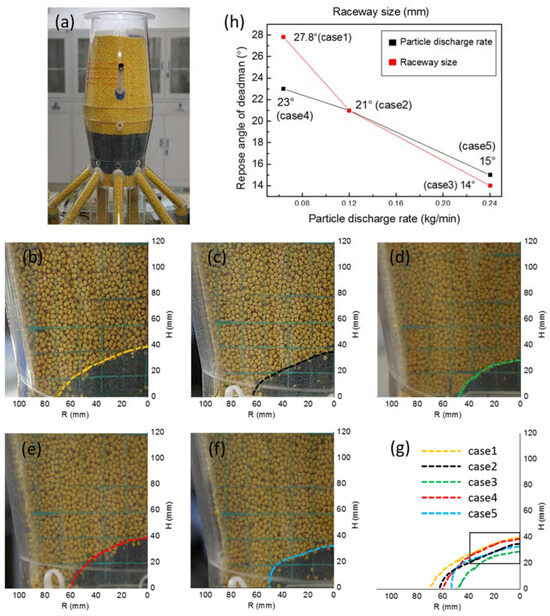 The deadman zone under different raceway conditions. (a) BF model. (b) case 1; (c) case 2; (d) case 3; (e) case 4; (f) case 5; (g) outlines of deadman; (h) the repose angle of the deadman zone from case 1 to case 5.
