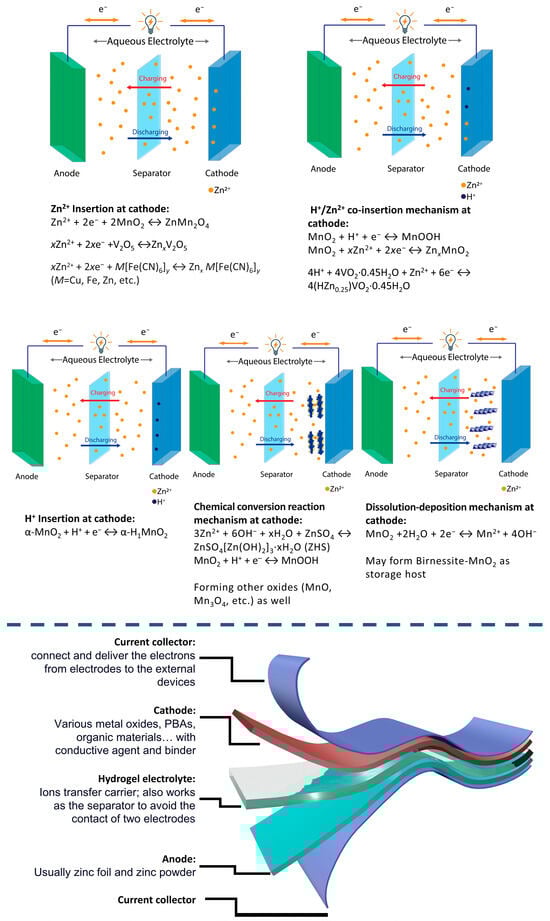 Top panel: Different storage mechanisms in common cathodes in ZIBs with hydrogel electrolytes. Bottom panel: Schematic diagram of a sandwich structure flexible ZIB and the functions of each component.