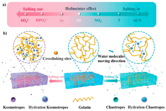 Hofmeister effect with Hofmeister series for anions (a) and salting-out and salting-in effects illustrated for hydrogel with kosmotropic ions and with chaotropic ions, respectively (b). Figure from [99] reprinted with permission.