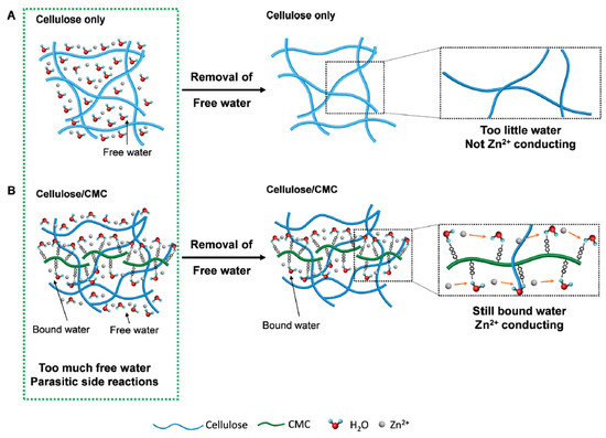 Schematic diagram illustrating the difference between cellulose-only hydrogel (A) and cellulose-CMC hydrogel (B). For both hydrogels, parasitic side reactions are induced in the case of too much free water. However, with the removal of free water, the ionic conductivity becomes too low for cellulose-only hydrogel in contrast to cellulose-CMC hydrogel. Figure from [100] reprinted with permission.
