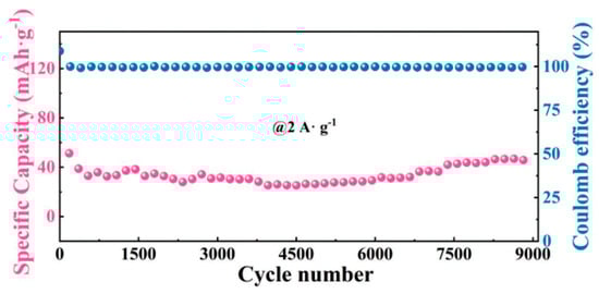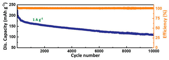 Long-term cycling performance, with discharging capacity on the left axis and Coulombic efficiency on the right axis, for ZIB with CMC-based hydrogel electrolyte at 1 A g−1 over 10,000 cycles. Figure slightly modified from [101] reprinted with permission.