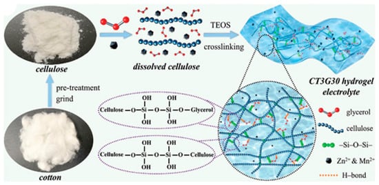 Hydrogel electrolytes with anti-freezing properties were developed for ZIBs using cotton as a raw material. This cost-effective approach involved adding tetraethyl orthosilicate as a cross-linker and glycerol as an anti-freezing agent (Figure 5) [103]. Cotton was treated with an alkali solution, ground, and dissolved in an aqueous ZnCl2 solution [103]. Glycerol was then added, followed by the cross-linker, to form a 3D porous network via covalent siloxane bonds [103]. The hydroxyl groups in the CMC skeleton inhibited the crystallization of water molecules and promoted the distribution of glycerol through the cross-link of siloxane bonds, contributing a stable ion transfer pathway. The resulting hydrogel electrolyte exhibited an ionic conductivity of 19.4 mS cm−1 at −40 °C, and effectively suppressed zinc dendrite formation and water-induced side reactions over a temperature range of −40 to 60 °C [103]. ZIBs with this hydrogel electrolyte and a MnO2 cathode demonstrated a specific capacity of 277.3 mAh g−1 at a current density of 0.2 A g−1, a capacity retention of 99.2% after 2000 cycles at 20 °C, a Coulombic efficiency of 99.9%, and excellent performance under harsh conditions, including bending, water immersion, and low temperature [103].