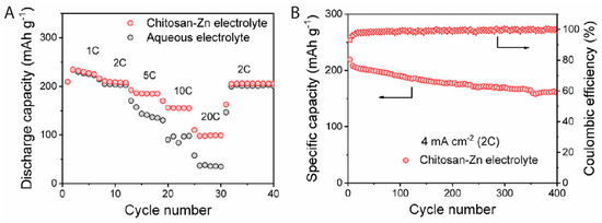 (A) Rate performance for the ZIB with PQBS cathode at rates ranging from 1 to 20C, comparing the ZIB with aqueous electrolyte and that with the chitosan-based hydrogel electrolyte. (B) Cycling performance, with specific capacity on the left axis and Coulombic efficiency on the right axis, of the ZIB with the chitosan-based hydrogel electrolyte at 2C with a PBQS loading of 10 mg cm−2. Figure slightly modified from [105] reprinted with permission.