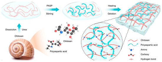 Schematic diagram illustrating the synthesis process to create the chitosan-based hydrogel electrolyte with polyaspartic acid, involving dissolution, mixing, and gelation steps. Figure slightly modified from [108] reprinted with permission.