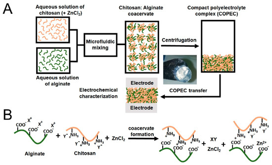 Alginate–chitosan hydrogel electrolyte. (A) Preparation method illustrating microfluidic mixing, centrifugation, and transfer steps, followed by electrochemical characterization. (B) Targeted ionic interactions between alginate and chitosan in the hydrogel electrolyte. Figure from [117] reprinted with permission.