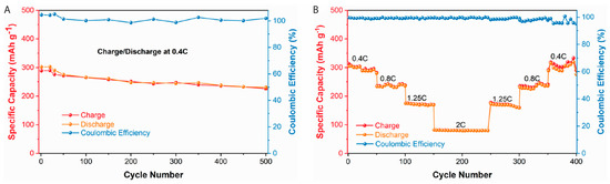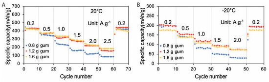 Rate performance of the ZIBs with xanthan gum hydrogel electrolyte for current densities ranging from 0.2 to 2.5 A g−1 at 20 °C (A) and at −20 °C (B). Figure slightly modified from [125] reprinted with permission.