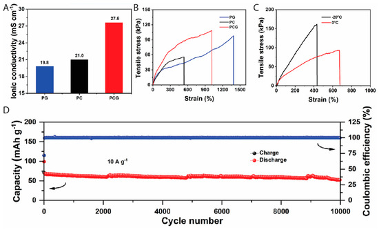 In another study, a gelatin-based electrolyte was employed to produce ultra-stable ZIBs with a MnO2 cathode [120]. Gelatin powder, dissolved at 10 wt% in an aqueous solution under stirring at 60 °C, was poured into a mold and rapidly cooled to 1 °C, followed by immersion in a ZnSO4/MnSO4 mixed aqueous solution [120]. The high concentration of inorganic salt induced a salt-reinforced effect, resulting in strong hydrophobic interactions and enhanced main chain strength in the hydrogel. Consequently, the hydrogel exhibited a mechanical tensile strength of 2.78 MPa [120]. ZIBs utilizing this hydrogel electrolyte and an α-MnO2 cathode demonstrated a specific capacity of 285 mAh g−1 at 0.1C, with a capacity retention of 90% after 500 cycles at 5C [120]. The study reported no capacity loss after bending 200 times, and immersion in water had no adverse effects on the battery’s performance [120].