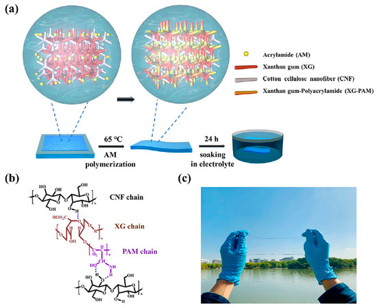 In pursuit of enhanced cycling stability, a nanocellulose–carboxymethyl cellulose hydrogel electrolyte was developed (Figure 3) [100]. This involved dispersing 0.1 wt% commercial cellulose nanofiber gel in deionized water, adding a 5 wt% CMC solution, and subjecting the dispersion to vacuum filtration [100]. The produced membranes were immersed in a 20 wt% NaOH aqueous solution and later in an aqueous solution of 2 M ZnSO4 [100]. The resulting hydrogel electrolyte exhibited a high tensile strength of 70 MPa, ionic conductivity of 26 mS cm−1, and excellent dendrite suppression due to controlled Zn2+ movement facilitated by the affinity of water with the CMC main chain [100]. ZIBs with this hydrogel electrolyte and a MnO2 cathode delivered a specific capacity of about 200 mAh g−1 at a current density of 2 A g−1, with a capacity retention of 95% after 500 cycles [100].