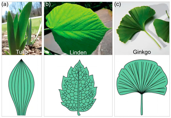 The pattern of veins within a leaf blade is referred to as venation. These veins are composed of vascular tissues, which play a crucial role in efficient fluid transport and heat exchange. The leaf veins connect the blade to the petiole and extend from the petiole to the stem. Through natural selection, various types of venation have emerged in plants (https://openstax.org/books/biology-2e/pages/30-4-leaves, accessed on 26 November 2023), with parallel and pinnate venation being the most prevalent [20]. As shown in Figure 1, for parallel venation, multiple veins run parallel to each other from the base to the tip of the leaf blade; for pinnate venation, it is characterized by one central vein called the midrib with smaller secondary veins branching out from it, similar to feathers on a bird’s wing. Each type of venation has its own advantages depending on various ecological factors, such as light availability, water availability, and temperature regulation requirements.
