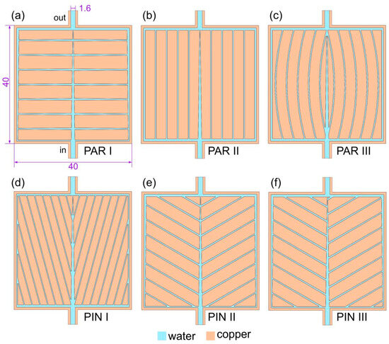 Figure 2 illustrates the physical model of the six MCHSs inspired by the intricate structure of leaf venation. The design incorporates two different arrangements: parallel (PAR) and pinnate (PIN). For all MCHSs, the aggregate thickness is 1.8 mm, the channel height (H) is 0.8 mm, the inlet and outlet width (W) is 1.6 mm, and the heat exchange area consists of a 40 × 40 mm2 surface.