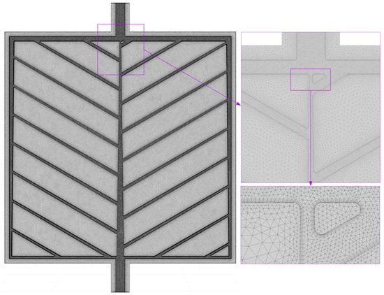The generation of the computational mesh for the physical model of MCHSs was accomplished using ANSYS Meshing. Taking the PIN III model as an example, Figure 3 depicts an unstructured grid for both the fluid and solid domains. The unstructured mesh consists of tetrahedra and triangular prisms. To more accurately capture the complex flow phenomena near the wall, it is essential to implement grid encryption.