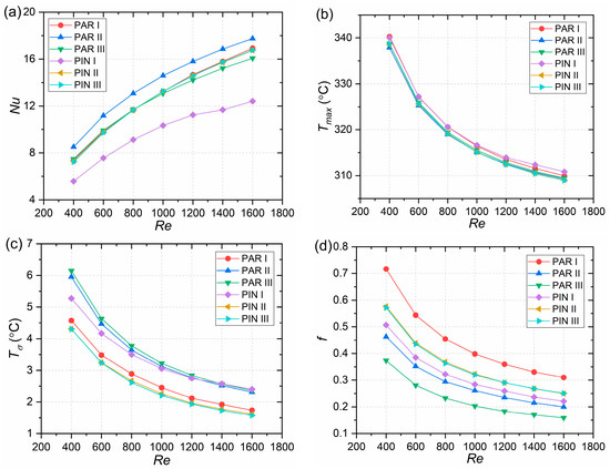 The influence of various leaf-vein structures on the thermal-hydraulic characteristics of MCHSs was investigated under the conditions of q = 50 kW/m2 and H = 0.8 mm. As illustrated in Figure 4a, within the range of Re examined, the Nu value of the PAR II MCHS is the highest, while that of PIN I is the lowest. The larger Re is, the larger Nu is. For the PAR II MCHS, the Nu value increases from 8.51 to 17.75 as Re increases from 400 to 1600; for PIN I, the Nu value ranges from 5.59 to 12.41. As illustrated in Figure 4b, PIN I exhibits the highest Tmax, while the other models exhibit more similar values. At a Re of 400, the Tmax value for the PIN I MCHS reaches 340.31 °C, whereas at a Re of 1600, it attains 310.83 °C. As illustrated in Figure 4c, within the Re range examined, the MCHS with the minimal Tσ is PIN III, while the maximum is PAR III. As Re increases from 400 to 1600, the Tσ of PIN III decreases from 4.30 to 1.58. As illustrated in Figure 4d, the f of the PAR III MCHS is minimal, whereas that of PAR I is maximal. When Re equals 400, f is 0.37; when Re reaches 1600, f reduces to 0.15.