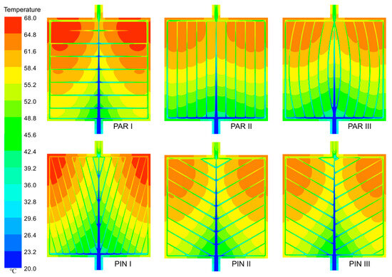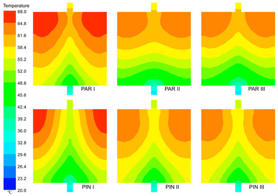 In terms of different flow structures, distinct variations in the temperature distribution can be observed. In the PAR flow structure, it is noteworthy that PAR II exhibits the lowest temperature among all the heat sinks. Among the PIN structures, PIN III stands out with its lowest temperature, while PIN II closely approximates it.