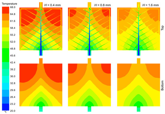 The temperature contours of the top and bottom walls of the PIN III MCHS are presented in Figure 8 for q = 50 kW/m2 and Re = 1000, revealing a gradual decrease in temperature with increasing H.