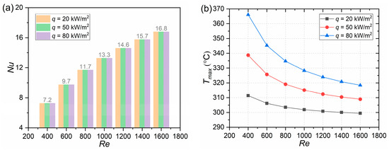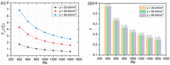 As an example, the heat flux of the heating wall in the PIN III heat sink was set to 20, 50, and 80 kW/m2. The influence of the heat flux on heat sink performance was investigated under the same Re. As illustrated in Figure 9, the heat flux does not affect Nu. When Re ranges from 400 to 1600, the Nu values for the heat sink are 7.24, 9.73, 11.68, 13.26, 14.59, 15.75, and 16.77. With the increase in the heat flux, Tmax also rises, along with an increase in Tδ. In addition, the heat flux has no impact on f.