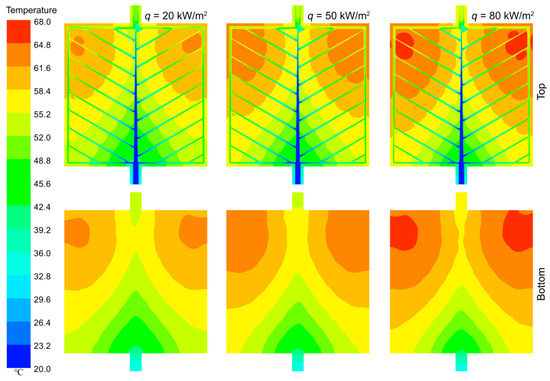 The temperature contours of the top and bottom walls of the PIN III MCHS are presented in Figure 10 for H = 0.8 mm and Re = 1000. It clearly demonstrates a gradual increase in temperature with the increment in the heat flux.
