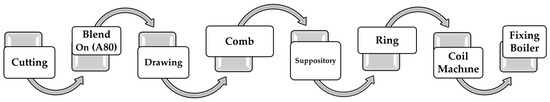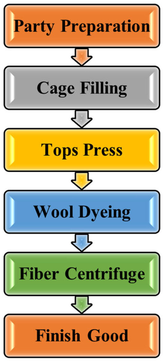 Process flow charts were created for each facility involved in the life cycle of the “Tricia” fabric, and detailed tracking was conducted. In Figure 1, the process flow chart showing the step-by-step operation of the Fiber Dye facility is shown. In Figure 2, the process flow chart showing the step-by-step operation of the Spinning facility is shown. In Figure 3, the process flow chart showing the step-by-step operation of the Weaving facility is shown. In Figure 4, the process flow chart showing the step-by-step operation of the Dye Finishing facility is shown.