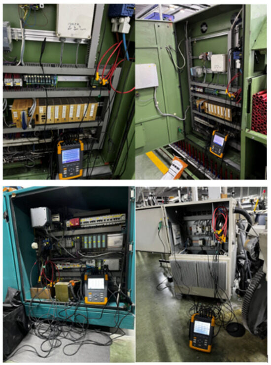 Energy analyzers were used for electricity measurements, while electronic natural gas meters were employed for natural gas measurements. Photos of these are shown in Figure 5. Energy analyzers were used to measure energy consumption, which is the most critical stage in the calculation of carbon emissions. In Figure 6, the energy consumption measurement with the help of energy analyzers for some processes is shown. The images from the processes of the “Tricia” fabric are shown in Figure 7. Among the analyzers used for the measurements, the models used in the Fiber Dye plant and Dye Finishing plant measure the electricity consumption instantly and record them continuously with the help of SCADA.