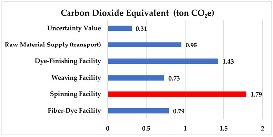 All processes of the production of the Tricia fabric in the Kıvanç Textile Factory, from fiber to fabric, were followed, and energy consumption calculations were carried out. The processes were followed by conducting separate calculations. In addition, carbon emissions arising from transportation in the chemical, dye, and fiber supply process are calculated and shown in Table 12. A total of 9.24 tons of CO2e carbon emissions were calculated during this transportation process. In this study, it has been calculated that 0.95 tons of CO2e carbon emissions occur in the transportation of raw materials for the Tricia fabric when the calculated fabric quantity is proportioned to the raw material used. The energy resources consumed by the fabric throughout its life cycle face some uncertainties in the processes. An uncertainty table has been created to account for variables in carbon emissions. In Table 13, the calculation table for carbon emissions resulting from these uncertainties is shared. The carbon emissions of the energy used in the processes are calculated separately and shown in Table 14. As a result of all calculations, a total of 6.00 tons of CO2e carbon emissions was calculated. The carbon emission values of the facilities where the processes take place in this process are shown in Table 15. The graphical representation of these values is shown in Figure 8.