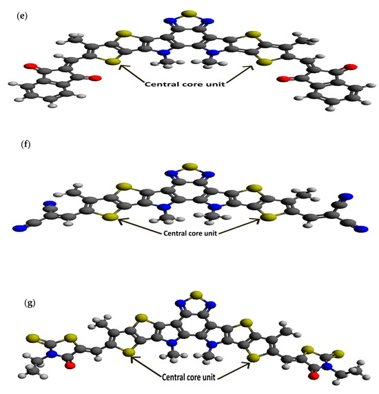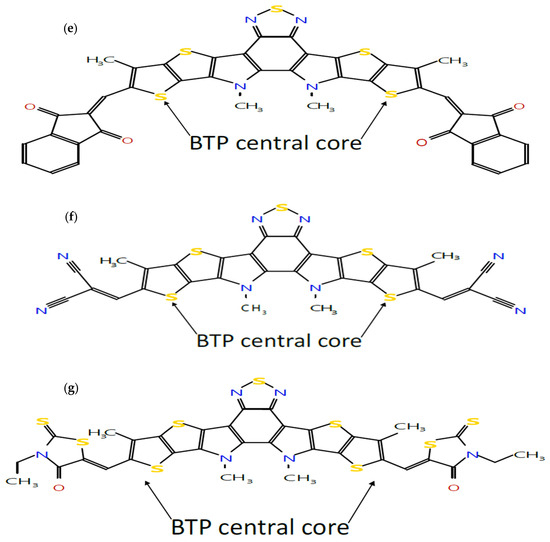 - Khalid, M.; Khan, M.U.; Razia, E.-t.; Shafiq, Z.; Alam, M.M.; Imran, M.; Akram, M.S. Exploration of efficient electron acceptors for organic solar cells: Rational design of indacenodithiophene based non-fullerene compounds. Sci. Rep. 2021, 11, 19931. [Google Scholar] [CrossRef]