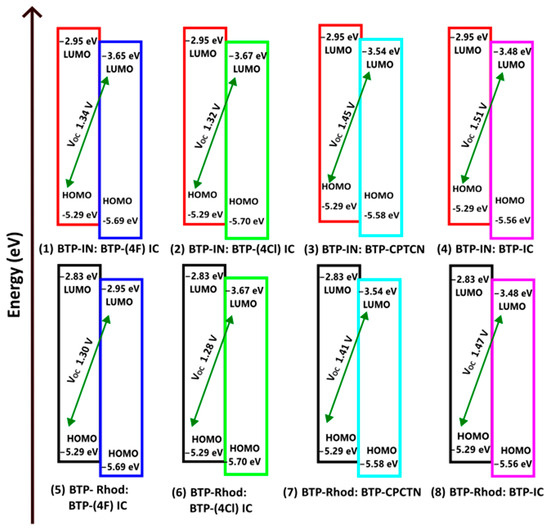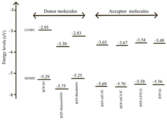 - Setsoafia, D.D.Y.; Sreedhar Ram, K.; Mehdizadeh-Rad, H.; Ompong, D.; Murthy, V.; Singh, J. DFT and TD-DFT Calculations of Orbital Energies and Photovoltaic Properties of Small Molecule Donor and Acceptor Materials Used in Organic Solar Cells. J. Renew. Mater. 2022, 10, 2553–2567. [Google Scholar] [CrossRef]